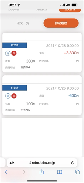 信用ロボアド【auカブコム証券】の運用結果(2021年10月25日~10月29日:ウィークリー)今週は2銘柄の返済買い
