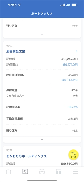 あと、[4502]武田薬品工業が下がったまま、上がる気配がありません。損益率が-13.74%になっています。