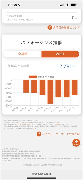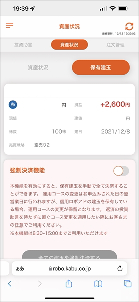 信用ロボアド【auカブコム証券】の運用結果(2021年12月6日~12月10日:ウィークリー)久しぶりに売り1銘柄約定