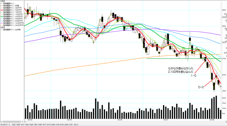 2018/8/10(金)にローソク足が節目の2,100円を割り込む。移動平均線が上から100日、60日、20日、10日、5日、3日の順番で下落傾向となっている。想定したシナリオ