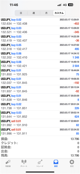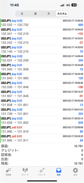 2023年3月13日~3月17日のFX自動売買トレード結果です。通貨ペアはUSDJPYです。Lot0.01で運用しています。