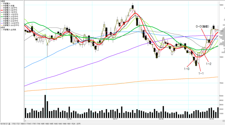 ①ローソク足が前の安値1,600円を陰線で割り込む:売りエントリー:1-0②ローソク足が5日線を踏んで陽線:買いエントリー:1-1