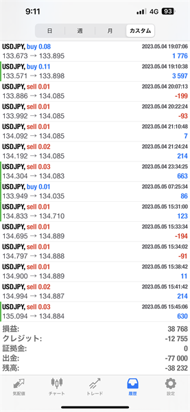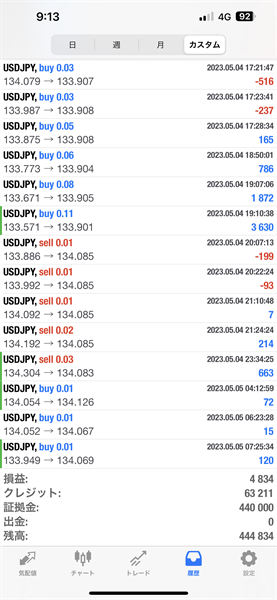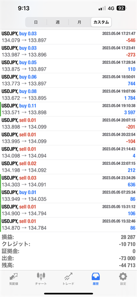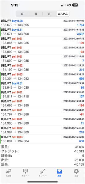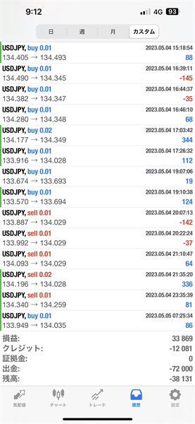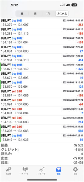 2023年5月1日~5月5日のFX自動売買トレード結果です。通貨ペアはUSDJPYです。Lot0.01で運用しています。