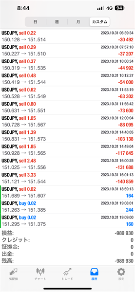 ロスカットで10月は1,048,734円の損失【FX自動売買の運用結果】(2023年10月:マンスリー)-1,048,734円【累計+4,046,604円】