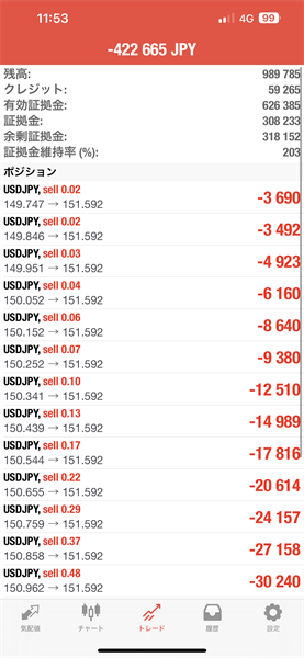 先週末の段階で、19ポジの売りを保有していて、Lot0.02運用で含み損が42万円ほどでていました。