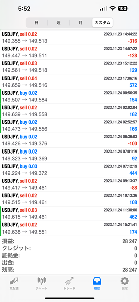 2023年11月20日~11月24日のFX自動売買トレード結果です。通貨ペアはUSDJPYです。