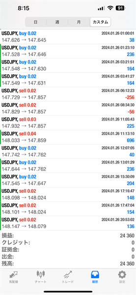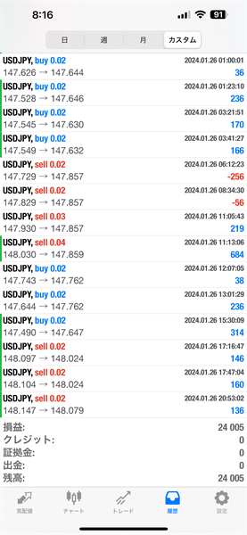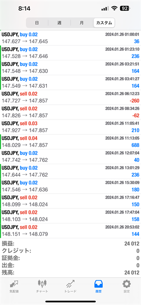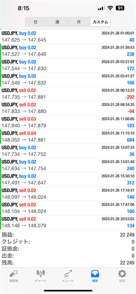 2024年1月22日~1月26日のFX自動売買トレード結果です。通貨ペアはUSDJPYです。