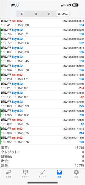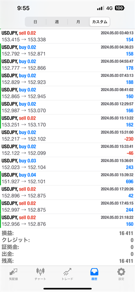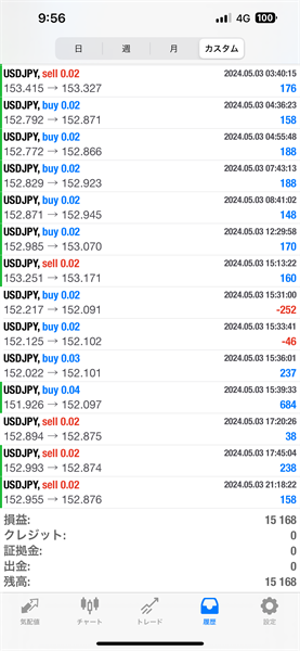 2024年4月29日~5月3日のFX自動売買トレード結果です。通貨ペアはUSDJPYです。