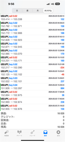 4/29の日銀介入時に、大きく上下に振れましたが、EAの処理が追い付かないのか、マイナスで決済されて、その日の利益が若干マイナスになりました。