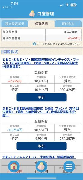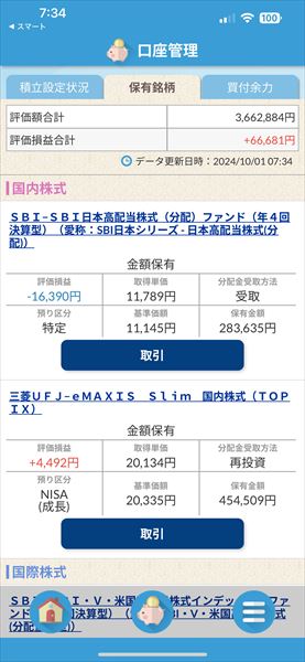 現在、投資信託の運用はSBI証券で行っています。(旧つみたてNISAは楽天証券で運用)新NISAでは定期積立、特定口座では余剰資金が出たタイミングでスポット購入しています。