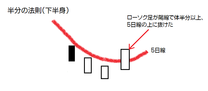 【条件1】・ローソク足(陽線)が半分以上5日線を越える