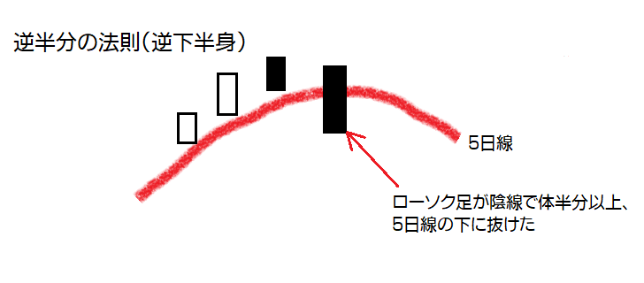 【条件1】・ローソク足(陰線)が半分以上5日線を割り込む