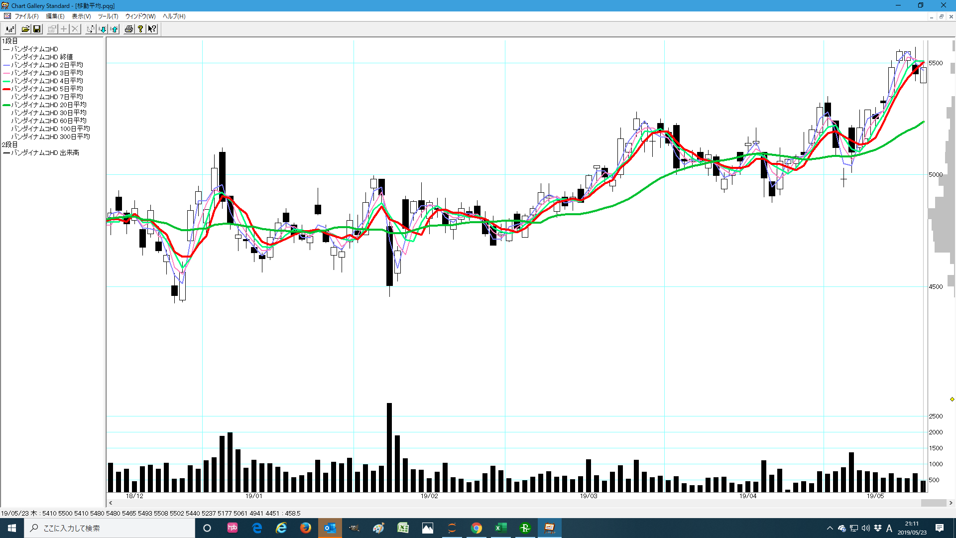 | 19/05/22 | 5,450 | -60 | 2日線が3日線を割り込んだ |