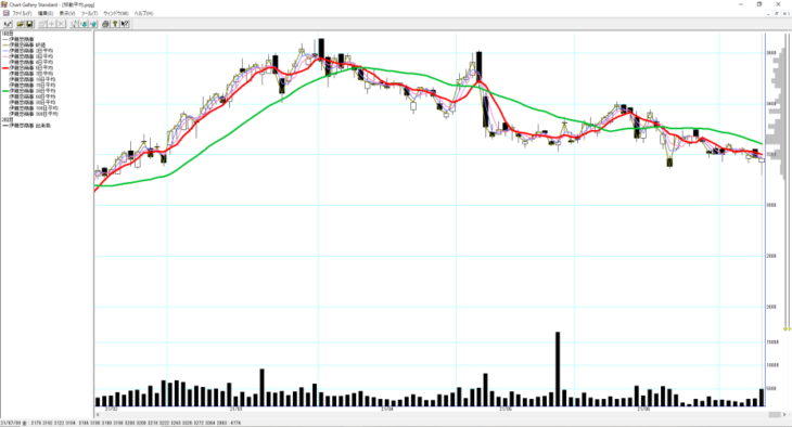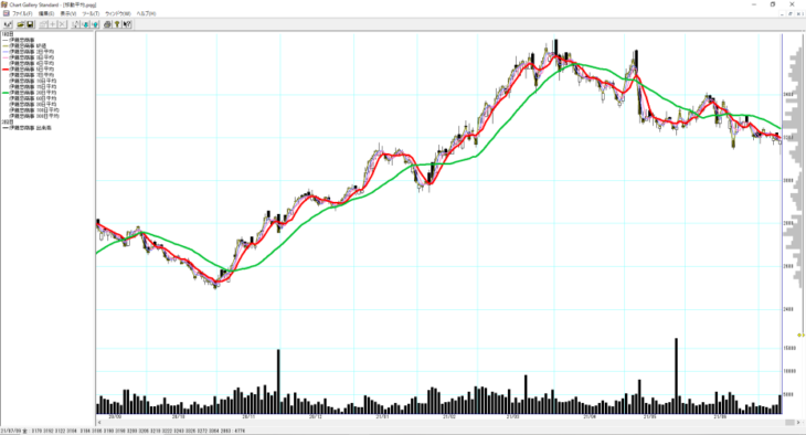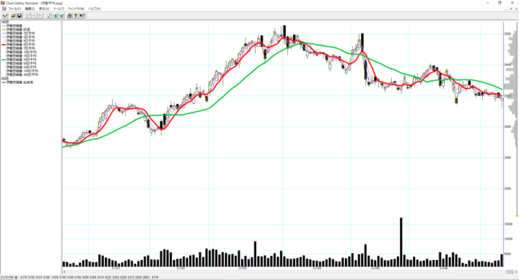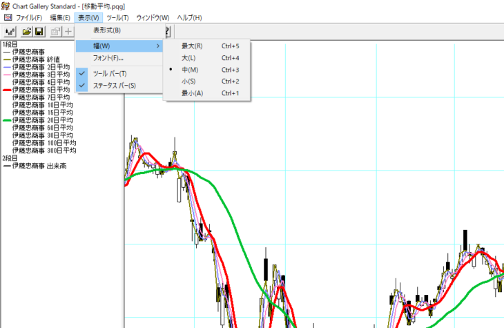私はチャートギャラリーでチャートチェック(日足)する際、チャートの表示幅を【大】にしています。私のパソコン環境では約6ヶ月分(日足)のチャートが表示されます。